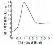图2为TAS-2A含量对填充PP缺口冲击强度的影响,由图2可见,TAS-2A含量对填充PP缺口冲击强度的影响很大,当TAS-2A含量为l份时,其缺口冲击强度达到最大值。