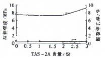 图3示出TA-2A含量对填充PP拉伸强度和断裂伸长率的影响。由图3可见,拉伸强度有逐渐升高的趋势,但断裂伸长率则变化不大,这是由于TAS-2A在填料与树脂之间起了相容剂的作用。
