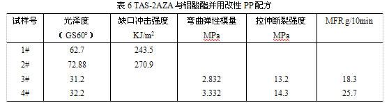 表6 TAS-2AZA与铝酸酯并用改性PP配方