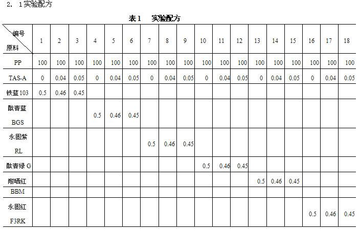聚炳烯(pp)F401,齐鲁石化公司;分散剂TAS-A ,苏州兴泰国光化学助剂有限公司;铁蓝 103,山东蓬莱新光颜料化工有限公司;4382酞青蓝BGS,常熟万佳颜料厂;永固紫RL, 南通龙腾化工有限公司;5319酞青绿G,常熟万佳颜料厂;耐晒红BBM, 杭州百合化工有限公司;永固红F3RK,杭州百合化工有限公司。