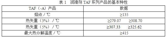 润滑剂TAF是以乙撑双脂肪酸酰胺(EBS)为基料,在催化剂的作用下,含有极性基团的反应性单体与EBS反应形成BAB型共聚物。这种共聚物既保持了EBS的润滑特性,又具有能与玻璃纤维、无机填料表面部分极性基团相结合的极性基团结构。在玻璃纤维增强或无机填充PA6、PA66、PBT等复合体系中,TAF在玻璃纤维、无机填料与基体树脂之间形成了极性分子层。改善了玻璃纤维、无机填料与基体树脂的粘结状态。进而改善了玻璃纤维、无机填料在基体树脂中的分散性。同时,润滑剂TAF又具有润滑特性,改进复合材料的加工流动性,提高复合材料的表面光洁度。