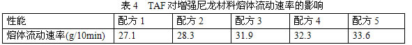 表4示出TAF对增强尼龙材料熔体流动速率的影响。从表4可以看出,随着TAF添加量的增加,尼龙增强材料的熔体指数呈上升趋势,至于添加量增加到多少,熔体指数能保持稳定,值得进一步探讨。不过由于在配方4中当组分到0.9%时,拉伸强度有下降趋势,因此笔者对此没做进一步的研究。